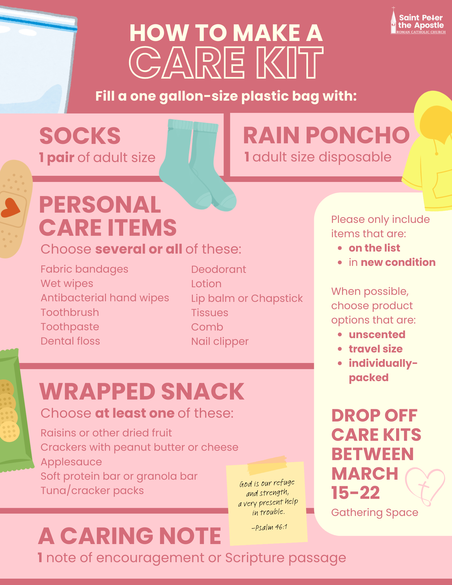 As we reflect on the Corporal Work of Mercy Shelter the Homeless during the week of March 15th, we as a parish will assemble care kits for neighbors experiencing homelessness. This is a simple, do-it-yourself service project — just follow the care kit instructions and return your completed kit(s) to the Gathering Space anytime between March 15–22.