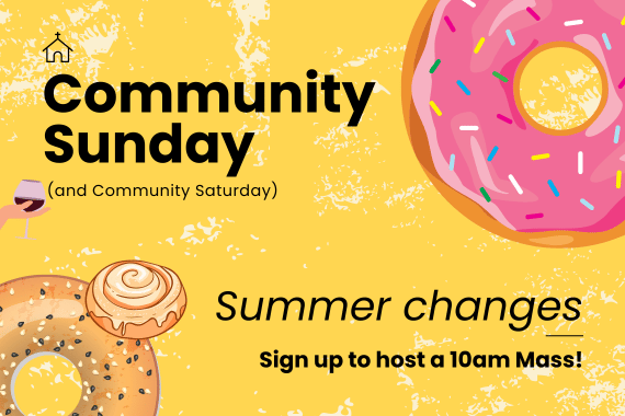 We’ll be making some summer adjustments to our Community Sunday (“Coffee and Donuts”) and Community Saturday (“Wine and Cheese”) after-Mass gatherings.